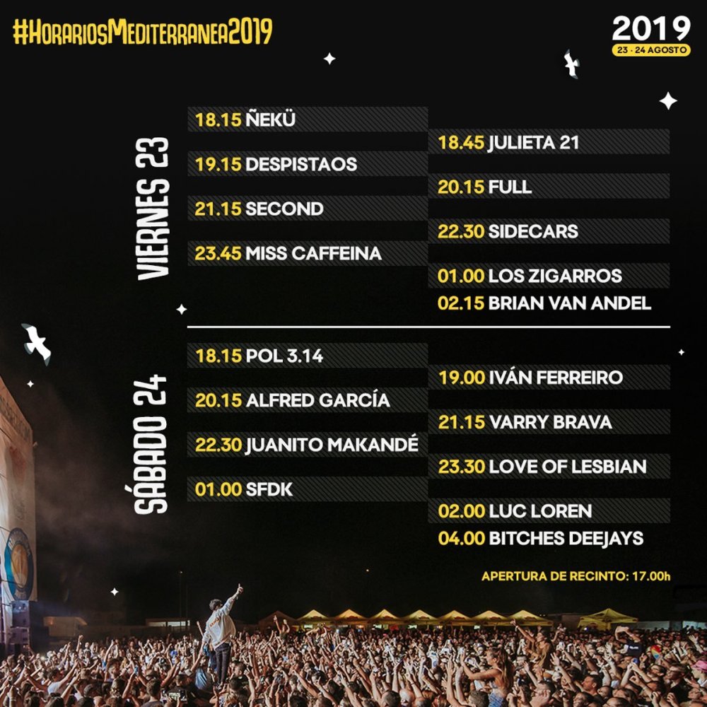 YA SON OFICIALES LOS HORARIOS DE LOS CONCIERTOS DE LA SEGUNDA EDICIÓN DE MEDITERRÁNEA FESTIVAL DONDE LOS PRÓXIMOS 23 Y 24 DE AGOSTO SE PODRÁ DISFRUTAR DE LOS CONCIERTOS DE LOVE OF LESBIAN, MISS CAFFEINA, IVAN FERREIRO, SIDECARS, ALFRED GARCÍA, SECOND, LOS ZIGARROS, FULL, SFDK, JUANITO MAKANDÉ, VARRY BRAVA, DESPISTAOS, FULL, LUC LOREN, BRIAN VAN ANDEL, ÑEKÜ, POL 3.14 y JULIETA 21, BITCHES DEEJAYS, además de un gran numero de sesiones DJ´s.